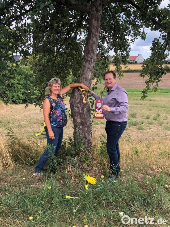 Mit der Markierung der weit über 50 Obstbäume der Gemeinde ist sichergestellt, dass die Grundstücke betreten und die Früchte von jedermann geerntet werden dürfen. "Gemeinsam Früchte zu ernten, sie zu essen oder zu Hause zu verarbeiten, ist ein bleibendes und besonders gesundes Erlebnis für alle", waren sich Christian Porsch und Barbara Dahinten beim Ortstermin einig. Bei der Aktion können übrigens auch Privatleute mitmachen, die ihren Obstbestand für die Allgemeinheit zur Ernte zur Verfügung stellen wollen. Sie werden gebeten, sich in der Gemeindeverwaltung bei Paul Dolata unter der Telefonnummer 09275/988-31 in der Bauverwaltung zu melden. Übrigens: Das gelbe Markierungsband und der Baumanhänger sind aus umweltfreundlichen Material hergestellt und verrotten problemlos.