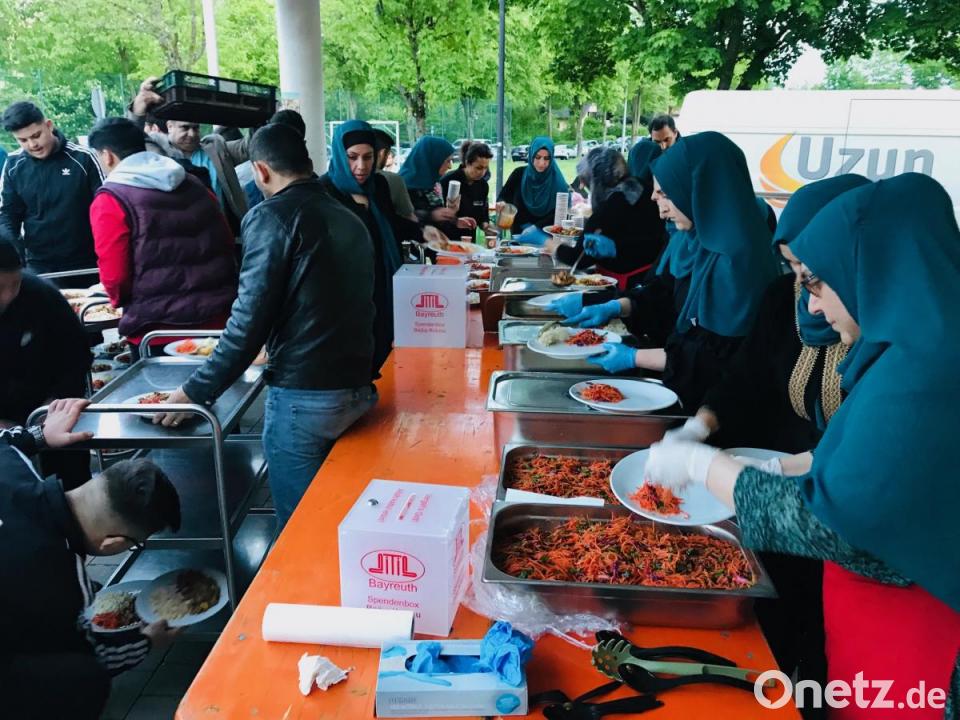 Nach einem beeindruckenden Auftritt des Mädchenchores der Ertugrul Gazi Moschee aus Bayreuth und einem gemeinsamen Gebet war schließlich das Fastenbrechen angesagt. Die vielen fleißigen Helfer teilten über 650 Essensportionen an die Gäste aus. Neben einer Suppe und einem Hauptgang wurden vor allem die süßen Nachspeisen sehr gefragt. Im Anschluss ging das Fest weiter.