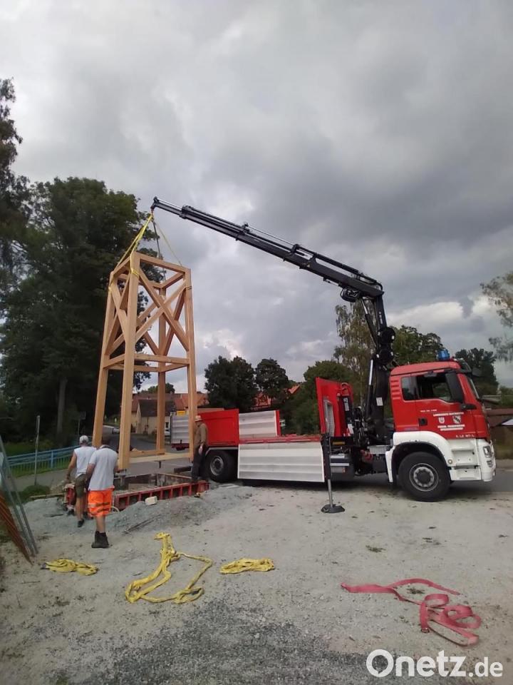 Mit vereinten Kräften ist der neue Glockenturm für die Ortsteile Guttenthau und Rosenhof in der Ortsmitte von Guttenthau aufgestellt worden. Die Firma Zimmermann hatte die Konstruktion aus Lärchenholz gefertigt.