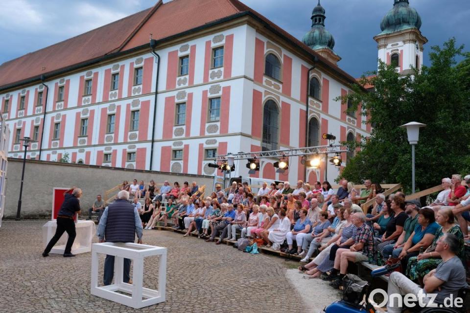 Der Beginn der volksnahen Komödie des Landestheaters Oberpfalz (LTO) in der bayerischen Bearbeitung von Molières Tartuffe mit Nicole Schymiczek als Regisseurin wurde noch vom romantischen Abendlicht des Sonnenunterganges begleitet. Im Speinsharter Klosterhof zwischen der Wieskapelle und der Klosterkirche war alles für einen kurzweiligen Theaterabend angerichtet. Im Mittelpunkt ein trickreicher "Herr Dadü" (Johannes Lukas), ein bigotter, mit allen Wassern gewaschener Halunke. Mit allerlei Schmeicheleien versuchte er als "Unternehmensberater" die Kaufmannsfamilie der Grandlgrubers einfallsreich um Haus und Vermögen zu bringen und die charmante Ehefrau des Kaufmanns zu verführen. Abrupt endete aber nach einer Stunde Spielzeit die von Menschenkenntnis und Komik geprägte Aufführung. Das Originalstück "Tartuffe" hatte Sonnenkönig Ludwig XIV. verbieten lassen. In Speinshart waren es Sturmböen und Regentropfen, die dem Stück ein vorzeitiges Ende bescherten. Gute Nachricht für die circa 100 Besucher: Die Eintrittskarten gelten auch für die Aufführung am Freitag, 21. Juli, um 20 Uhr.