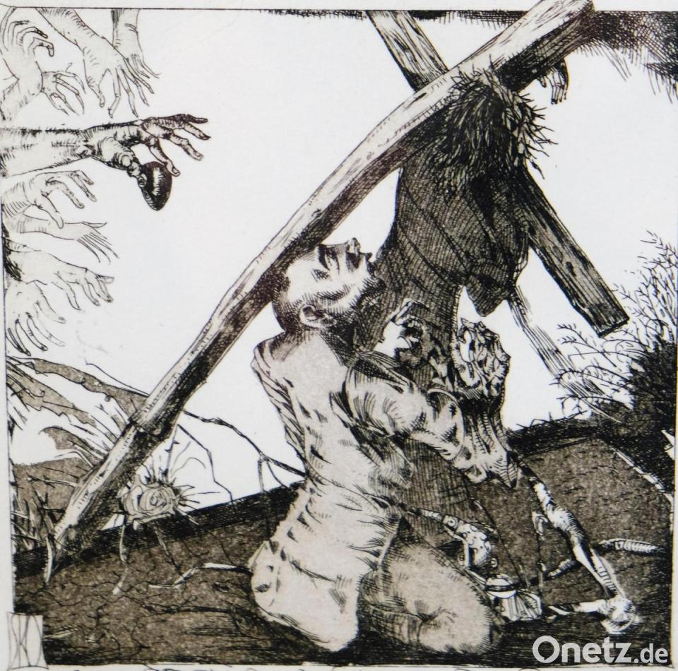 In diesen Tagen und Wochen an Aktualität nicht zu überbieten. Die Coronakrise lähmt uns immer noch, der Krieg in der Ukraine zerstört Leben, zerbricht vieles, bringt Sorge und Angst. Der „Verlierer“ ist trotzdem der Tod, sagt der Künstler bei der Ausstellungseröffnung. Klenner-Otto zeichnet in seinem „Kreuzweg“ den Kern des Glaubens und der Hoffnung. Die Literatur bildet das Zentrum im künstlerischen Schaffen des Oberfranken. Seine Spezialität sind Porträts von Dichtern und Komponisten, dazu Illustrationen biblischer Weltliteratur. Meist handelt es sich um Radierungen. Bei der Vernissage begegnen zahlreiche Besucher einem humorvollen und lebensfreudigen Künstler, ganz im Gegensatz zu den Radierungen über das Leiden Jesu Christi in den 14 Kreuzwegstationen. Klenner-Otto ist kein religiöser Künstler. Das kommt ihm bei einem solchen Thema eher zugute. Die eindringlichen Radierungen sind frei von jeglichem Pathos und von Frömmelei. Sie geben hingegen dem zu erwartenden Tod und dem Leid auf dem Weg dorthin Ausdruck und ästhetische Gestalt.