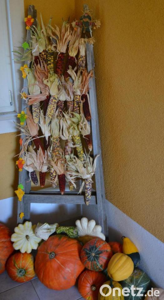 Ein Herbstfest für die Augen zaubert Iris Wiesend aus Haselbrunn in Haus und Wohnung. Zierkürbisse und Ziermais gehören zum farbenfroh leuchtenden Ensemble ihrer herbstlichen Dekorationsideen.