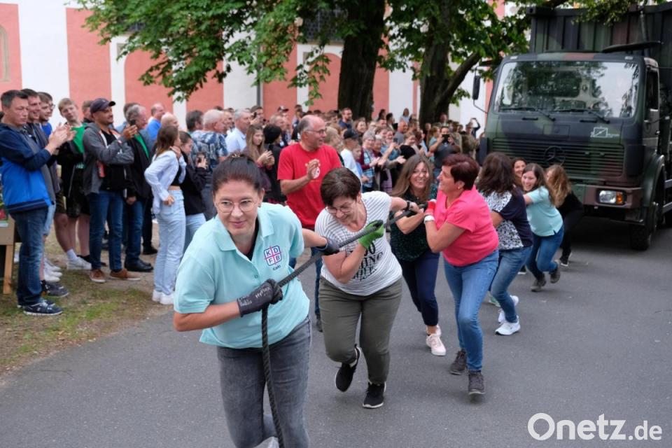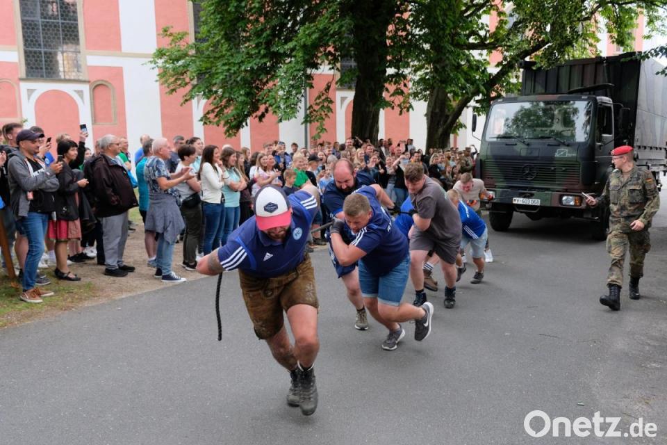 Los ging am Samstagabend das 20. Speinsharter Bürgerfest mit einer Riesen-Gaudi. Die Bundeswehr-Pateneinheit der Gemeinde hatte Speinsharts starkes Geschlecht zum Seilziehen eingeladen. Eine blendende Idee, die nicht nur die Vereinswelt elektrisierte, sondern schon zum Start des Festes Hunderte von Besuchern anlockte. Die 2. Batterie des Artilleriebataillons 131 der Bundeswehr aus Weiden mit Hauptmann Dominik Kakoutsis und Feldwebel Pascal Seyschab legte die Messlatte des Wettbewerbs ziemlich hoch. Auf einer Länge von 30 Metern und leicht bergauf musste ein 10-Tonner-Militärfahrzeug des Typs Mercedes Daimler 1017 auf der Dorfstraße des Klosterhofes bewegt werden.