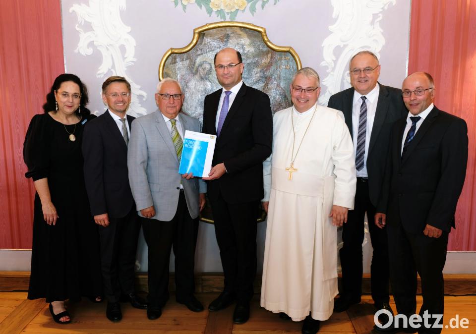 Nur strahlende Gesichter sind im Musiksaal des Klosters Speinshart zu sehen. Grund ist der Förderbescheid für die Erstellung einer Machbarkeitsstudie, die Strategien zum wirtschaftlichen Betrieb und zur künftigen Ausrichtung der Internationalen Begegnungsstätte aufzeigen soll. Unser Bild zeigt (von links) Sissy Thammer (Jugendfestspieltreffen Bayreuth), MdL Tobias Reiß, Georg Girisch, Chef des Fördervereins, Minister Albert Füracker, Abt Hermann Josef Kugler, Bezirkstags-Vizepräsident Lothar Höher und Bürgermeister Albert Nickl bei der offiziellen Übergabe.