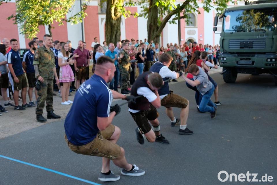 Stimmgewaltig dürfte auch der Auftakt im Klosterhof sein, wenn am Samstag um 19.30 Uhr die Soldaten der Bundeswehr-Pateneinheit zum Gaudi-Seilzieh-Wettbewerb rufen. Nur eine Angelegenheit für Speinsharts Muskelmänner? Nichts dergleichen. Beim letzten Wettbewerb bewies auch die Damenwelt ihre Stärke, ein 12-Tonner-Fahrzeug der Bundeswehr über eine Strecke von 30 Metern möglichst schnell zu bewegen. Eine Mannschaft besteht aus sieben Personen. Als Sieger-Preise locken für die Herren Fassbier-Gutscheine. Das beste Damenteam erhält einen Gutschein aus der Weinhandlung Pfleger. Anmeldungen sind bei Bettina Bitterer, VG Eschenbach per Email bbitterer[at]eschenbach-opf[dot]de oder telefonisch (09645/9200-16) möglich. Auch Kraftprotze aus der Region können sich zusammentun, um beim Gaudi-Wettbewerb mitzumischen.