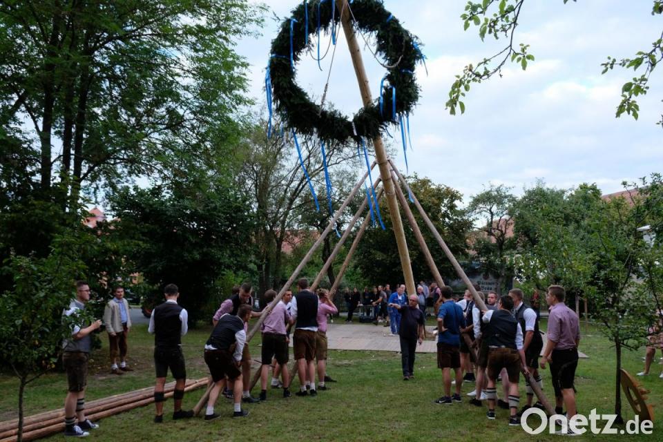 Hunderte von Besuchern verfolgten am Freitagabend das Aufstellen des Kirwabaumes. Die Burschen der Landjugend und junggebliebene Mannsbilder der Dorfgemeinschaft packten kräftig zu, um den Kraftakt zu bewältigen. Einen mächtigen Baumstamm mit 24 Metern Länge galt es, unter dem Kommando von Georg und Sebastian Müller empor zu wuchten.