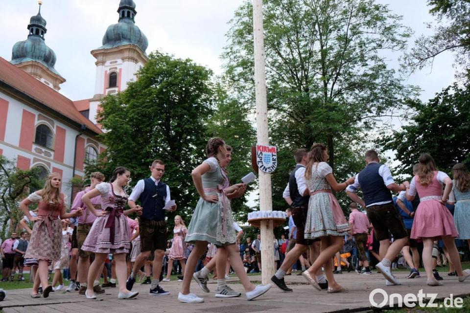 Danach konnte ein Fest ungetrübter Freude beginnen. Die Landjugend brachte die Kirwa-Gaudi ins Dorf. Nach dem "Kirwa-Asgrom“, der Fundort blieb nach dem „Kirwa-Eigrom“ vor einem Jahr bis zum Freitag streng geheim, ging es auf dem Festplatz zwischen den Zwillingstürmen der Klosterkirche und dem Haus der Dorfkultur wortwörtlich rund. Seit einigen Jahren gehört das Austanzen des Kirwabaumes wieder zum Festgeschehen. 16 fesche Paare waren es, die nach intensiven Proben ihre tänzerischen Qualitäten bewiesen. Choreografisch vorbereitet von Nicole Kroher und Sabrina Seitz formierten sich die Tanzpaare um den Kirwa-Baum, um den Publikum zuzurufen: „Heid danz ma um an Kirwabam mit seiner greyna Spitz, da Bou unds Moidl hupfen rum und Spoinsad kummt in d’Hitz.“