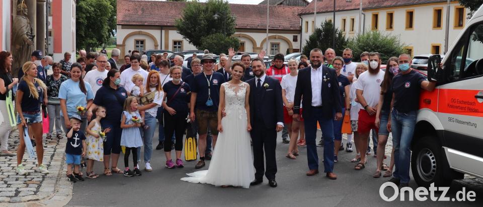 Kurz und kräftig ertönte am vergangenen Samstag das Martinshorn vor der Speinsharter Klosterkirche. Der Grund dafür war aber kein Notfall, sondern ein freudiges Ereignis. Vor Pater Adrian gab Andreas Ott aus Haselbrunn seiner Frau Maren Ott, geborene Retzer aus Schlammersdorf, das Jawort. Für die stimmungsvolle musikalische Untermalung sorgte die Gruppe "Montana". Als das glückliche Paar anschließend aus der Kirche trat, wartete ein Spalier aus rund 30 Wasserwachtsmitgliedern mit Flossen und Verbandmull. Mittels stumpfer Scheren schnitten sich der 38-jährige Inspektor im Notardienst, der in Weiden tätig ist, und seine Frau Maren den Weg frei. Anschließend war Geschicklichkeit gefordert. Mit einem Wurfsack musste zuerst der Bräutigam einen Ring treffen, den die Braut in Händen hielt. Dann wurden die Rollen getauscht. Die 30-jährige Betriebswirtin, die als Referentin bei der IHK in Bayreuth arbeitet, traf auf Anhieb. Der sich anschließende Sektempfang und die Snacks zur Stärkung kamen dann gerade recht. Andreas ist langjähriges Mitglied der Eschenbacher Wasserwacht und dort als Technischer Leiter, Tauchausbilder und als treibende Kraft, wenn es um Übungseinsätze und Ausbildungen geht, unverzichtbar. Seine Frau entspannt sich bei Gartenarbeit. Gemeinsam genießen sie Urlaubsreisen und Radfahrten. Vor der kirchlichen Zeremonie traute Bürgermeister Albert Nickl das Paar im Wieszimmer in Speinshart standesamtlich. Als der offizielle Teil abgeschlossen war, fuhr das Paar mit Hochzeitsgesellschaft nach Weiherhammer, wo im „Elements“ weitergefeiert wurde.