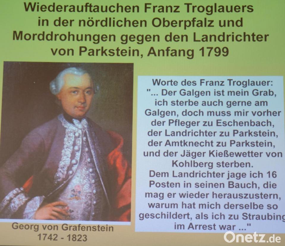 1786 wurde Troglauer das erste Mal zu einem Zuchthaus-Aufenthalt in Amberg verdonnert. Weitere Verurteilungen wegen Gaunereien folgten. Ihren Zweck erfüllten sie nicht. Denn nachdem Troglauer seine dritte Haftstrafe verbüßt hatte, bildete er mit seinen Geschwistern eine berüchtigte Räuberbande, ehe er sich mit weiteren Familienangehörigen der sogenannten „Großen Fränkischen Diebes- und Räuberbande“ anschloss. In der Folge sei die Bande für eine außerordentlich große Zahl an Diebereien, Einbrüchen und Überfällen verantwortlich gewesen, berichtete Weigl. Als spektakulärstes Beispiel nannte er den Einbruch in das Palais des Bamberger Weihbischofs Johann Adam Behr mit der Erbeutung von wertvollem Diebesgut und einem Gesamtschaden von 12.000 Gulden. Auch der Bischofsstab sei damals „mitgegangen“, wusste der Autor. Auch Morddrohungen gegen Landrichter Georg von Grafenstein aus Parkstein und den Landpfleger aus Eschenbach gehörten zu Troglauers Einschüchterungsstrategie.