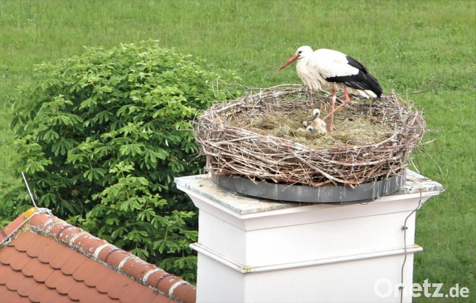 Das Kloster Speinshart hat Nachwuchs bekommen. Eigentlich eine sensationelle Meldung. Neue Patres in der Prämonstratenserabtei? Doch Pater Johannes Bosco meldete nicht drei Neuankömmlinge im Kloster, sondern auf dem Dach des Klostergasthofes. Dort oben in luftiger Höhe hatte im März der Gemeindebauhof mit Einwilligung der Abtei auf der Kamin-Attrappe des Gebäudes ein Storchennest installiert. Ein Luxusappartement, wie damals Pater Benedikt Schuster und Naturpark-Ranger Stefan Niclas betonten. Beide zeichneten auch für den fachgerechten Horstbau „nach wissenschaftlichen Erkenntnissen“ verantwortlich.