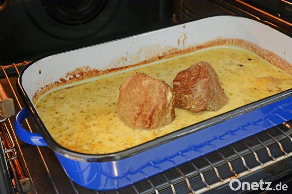 Zugedeckt bei kleiner Hitze eine Stunde schmoren. Dann die Sahne angießen. Die Sauce mit Pfeffer, Salz, Zucker und Muskat abschmecken. Weitere 30 Minuten köcheln lassen. Das Fleisch aus der Sauce heben und in Scheiben schneiden. Die Sauce durch ein Sieb passieren und getrennt dazu reichen.