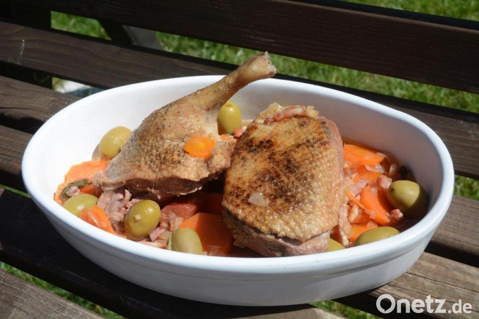 Zubereitung: Die Ente waschen, trockentupfen und in Portionsstücke zerteilen. Kräftig mit Salz und Pfeffer einreiben. Oliven in einem Schmortopf erhitzen und die Entenstücke darin goldbraun anbraten. Die Stücke herausheben und beiseite stellen.