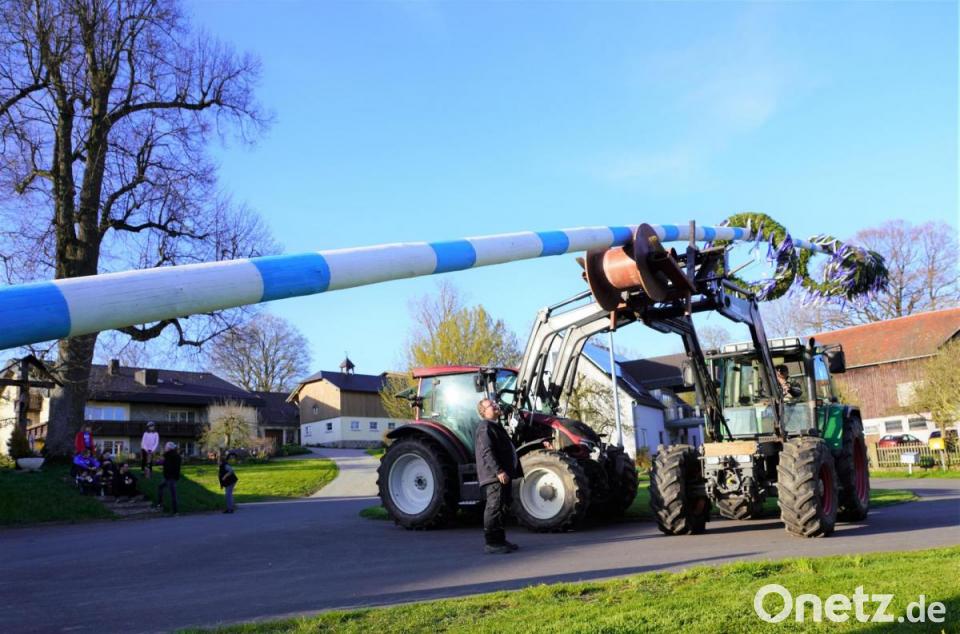 Am Vormittag war der 30 Meter hohe Maibaum von Spielberg noch im Wald von Martin Schwab, am „Schönen-Blick-Bankerl" bei Wampenhof. Acht Stunden später hat die Feuerwehr Spielberg ihn geschmückt und Rautenmuster in die Rinde geschnitzt. Wie üblich hatte Karl Greiner und sein Sohn Johannes mit der Kraft des Kranes präzise den Baum in Stellung gebracht. Die Menschen genießen nun den Frühlingsgruß mitten im Dorf an der Grenze zum Flosser Land.