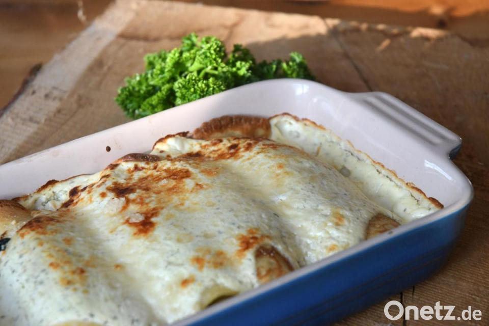 "Feiner Spinat wird hier in Pfannkuchen gerollt und mit Sauerrahm überbacken. Das Gericht lässt sich auch prima vorbereiten", sagt Michael Schiffer. "Pfannkuchen backen und die Spinatfüllung zubereiten." Später werden dann der Sauerrahm bereitet, die Pfannkuchen gefüllt, gerollt und überbacken.