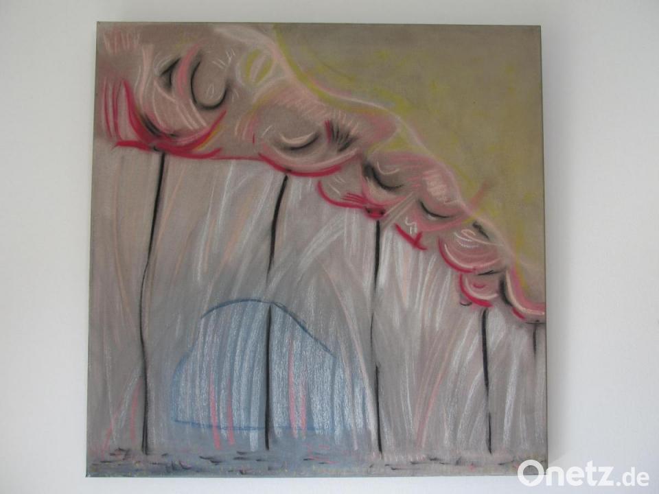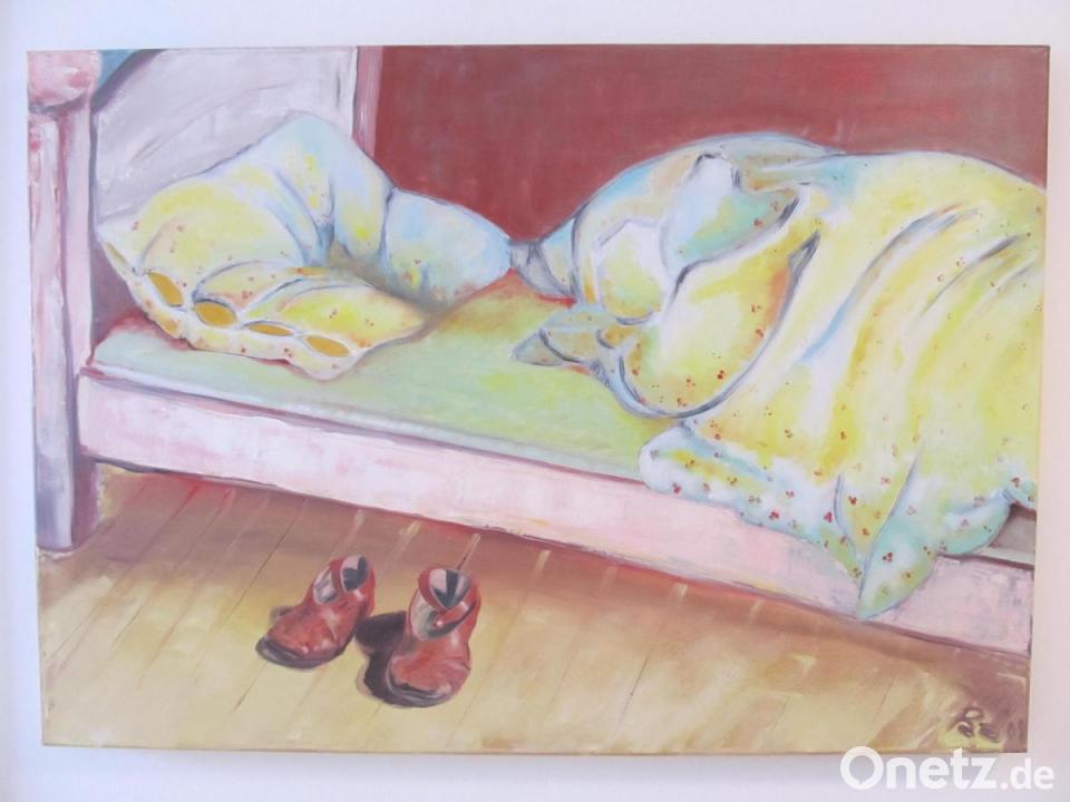 Aufträge sind für sie da "wie Schubser". Dann lässt sie Ideen wachsen, geht mit ihnen schwanger und packt schließlich die Leinwand aus. In welche Richtung sie diese Ideen führen, dass ist völlig offen. "Einen Stil kann man nicht forcieren", hat sie festgestellt, "da ist es mir wichtiger, authentisch zu bleiben. Dann bekommt der düstere Wald mit seinen monotonen Fichten eben ein Farbspektrum verpasst, währende das Bild mit dem Titel "Reise in den Herzensgarten" ins Abstrakte driftet. Und das ungemachte Bett mit den roten Schuhen davor deutet an, wohin seine Schöpferin unterwegs ist: zu einem Aufbruch ins Ungewisse.