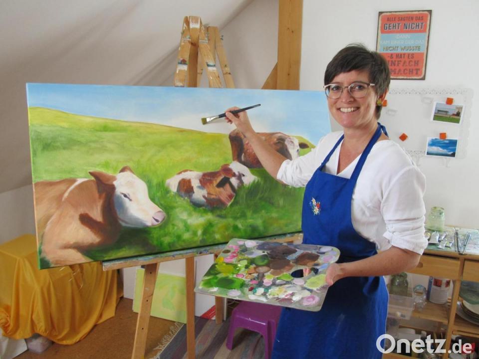 "Mich macht es einfach happy, wenn meine Bilder andere Menschen ansprechen", erklärt die Malerin. Auf der Staffelei im Arbeitszimmer steht eine Leinwand mit drei stattlichen Kühen auf einer grünen Wiese, auch so ein Auftragswerk. "Der Himmel ist noch nicht fertig", sagt die Schöpferin dieser Szene. "Da steckt noch Unsicherheit drin, die Pinselstriche sollten mutiger sein", kommentiert sie selbstkritisch und fügt dann hinzu: "Man muss mit seiner Vorläufigkeit aber auch zufrieden sein."