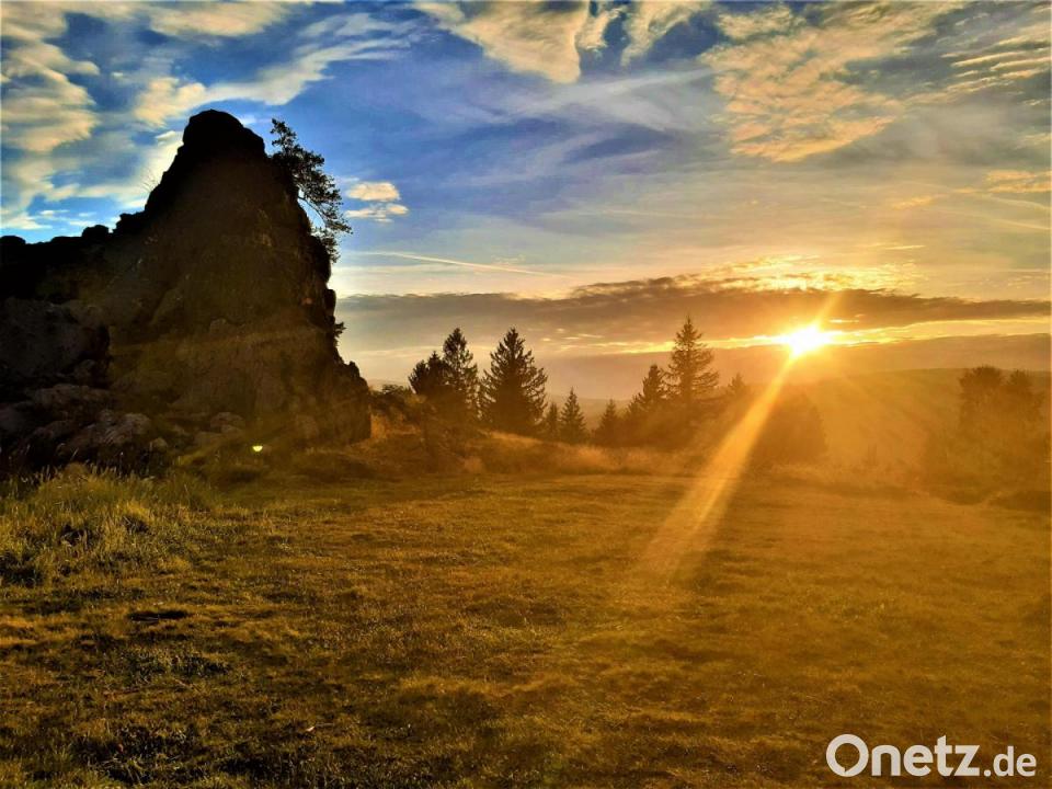 Die tiefstehende Oktobersonne verwandelt das Naturdenkmal Hochfels in Stadlern in eine mystische Landschaft. Der Kontrast des Himmels zur warmen lichtdurchfluteten Heidevegetation, die sich um die bizarr herausragende markante Felsrippe entfaltet, erinnert fast an ein Gemälde.