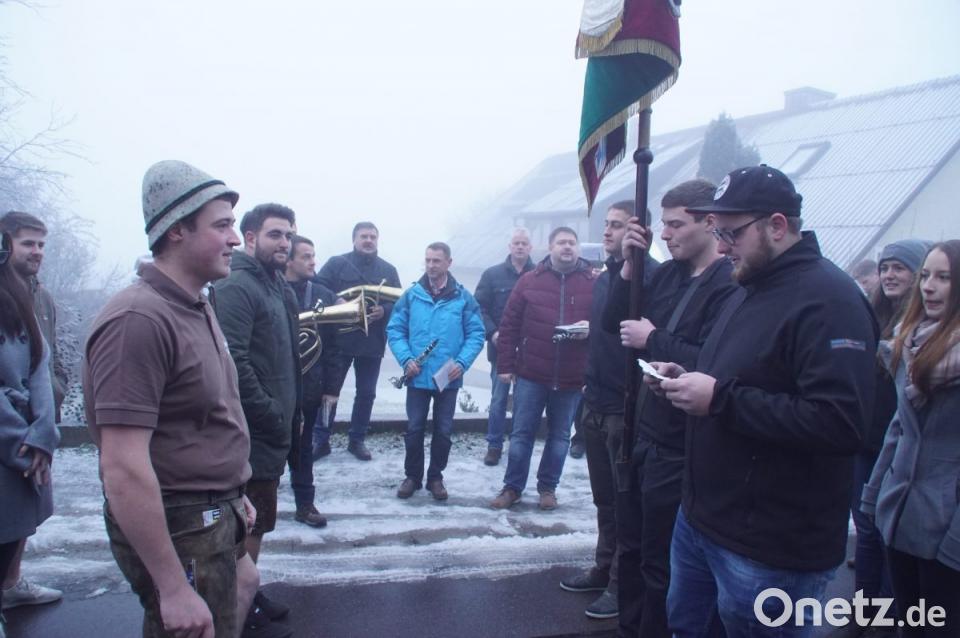 Das habe die Dorfjugend auch nicht vor, betonte Tobias Wiezorreck in seiner Erwiderung. Damit sie aber sehen, wie ernst die Sache gemeint sei, müssten schon einige Aufgaben erledigt werden. Balance war bei der ersten Hürde gefragt, denn da galt es, freihändig auf einer Leiter stehend, vorbereite Getränke zu schlürfen und diese zu erraten. Weiter hatten junge Damen aus den Reihen der Bittsteller einen Baumstamm durchzusägen; dass dabei zur Verfügung gestellte Werkzeug nicht das beste war, zeigte sich bei ihrer Arbeit. Gerne hörten dann alle, so mancher Bursch in kurzer Lederhose bei Temperaturen um den Gefrierpunkt, dass die dritte Aufgabe im inneren des Wirtshauses gestellt wird. Wie erwartet lagen drei Holzscheit bereit, auf diesen kniend warteten Andreas Bauer, Lukas Frank und Florian Ring auf so manche heikle Frage (Wer wüsste da auf die Schnelle, dass die Bibel 4 410 133 Buchstaben hat).