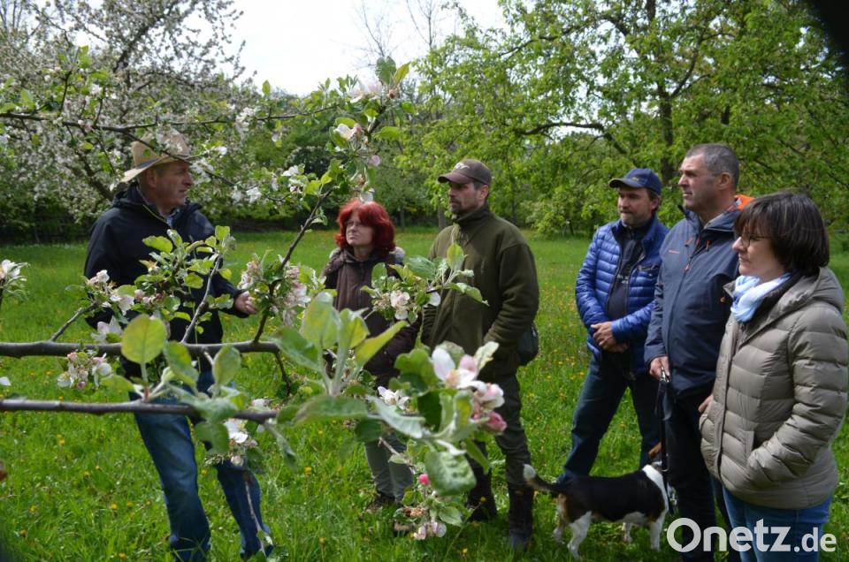 Je besser die Bestäubung, desto besser der Ertrag. Das weiß Josef Bernhard. Der Inhaber der Mosterei Bernhard in Steinach hat mit Imker Siegfried Meier einen Partner gefunden. Meier stellte auf dem Streuobstgelände die Kästen von zwölf Bienenvölkern auf. Die rund 700.000 Weidener Gastarbeiterinnen haben somit einen kurzen Weg zur Arbeit. Sie sichern den Ertrag von über 300 Obstbäumen und einer weiteren großen Zahl Beerenobst. Bernhard legt Wert auf alte Obstsorten, die für das Klima der Region geeignet sind. Der Inhaber erklärte bei einer Führung durch die Streuobstwiese, wie ein Obstbaum zu pflanzen ist, sprach vom Wühlmaus- und Stammschutz und gab Tipps für die Obstsortenauswahl im heimischen Garten.
