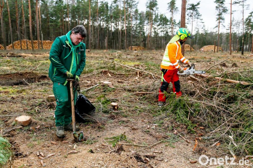 Vor wenigen Tagen begann die Neupflanzung von Hand: 4400 Rotbuchen, 6800 Eichen und 1700 Hainbuchen werden mit dem Hohlspaten gesetzt. Die Rotbuchen werden unter den ausgelichteten Kiefernbestand platziert. Eichen und Hainbuchen ersetzen den komplett entfernten Fichtenbestand. Das Unternehmen "Landschaftspflege Reiger" aus Bodenwöhr übernimmt die Aufgabe. Uwe Binner überwacht als Freiberufler für Uniper die Maßnahme. An den Rändern des künftigen Waldes und an den Wegen werden zum Abschluss stufenweise 450 Sträucher wie Hartriegel, Weißdorn und schwarzer Hollunder gepflanzt, in zweiter Reihe 450 Bäume wie Feldahorn, Vogelkirsche und Wildobstbäume, ehe die höher wachsenden Buchen und Eichen kommen. Zum Schutz vor Verbiss wird das Gelände eingezäunt. Der Zaun kommt weg, wenn die Schößlinge "aus dem Äser" sind, also höher gewachsen, als sie Rehe verbeißen können. Die "Torso-Bäume," auch Totholzhaufen aus Stamm- und Ast-Resten sollen Vögeln, Fledermäusen und Insekten Lebensräume bieten.