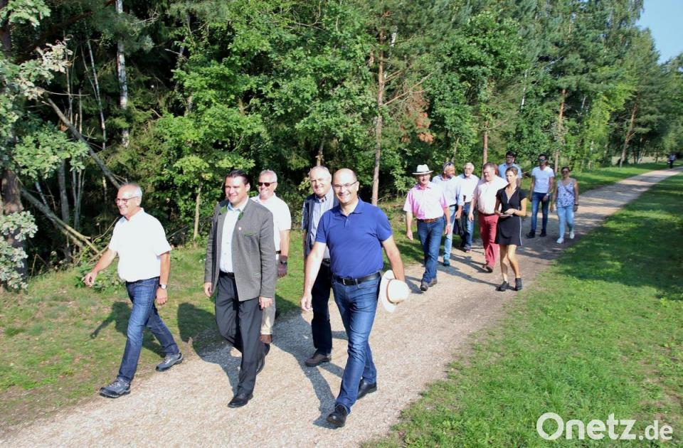 Dort wurde die kleine Gruppe, die neben dem Minister aus Nürnberg noch aus dem Vizepräsidenten des Bezirkstags, Lothar Höher, Landrat Thomas Ebeling und den Bürgermeistern der Seenland-Gemeinden bestand, von Joachim Häring in Empfang genommen, der die Gäste im Namen des Zweckverbands Oberpfälzer Seenland willkommen hieß. Häring erinnerte an den Erfolg der ersten Oberpfälzer Seenland-Wanderwoche im vergangenen Jahr, so dass sich der Zweckverband Oberpfälzer Seenland zusammen mit seinen acht Mitgliedskommunen entschieden habe, auch in diesem Jahr - vom 22. September bis 3. Oktober - eine Seenland weite Wanderwoche zu veranstalten. "Ganz besonders freut es uns, dass wir im Vorfeld unserer Wanderwoche mit Staatsminister Albert Füracker einen Teil des Oberpfälzer Seenlandes erwandern dürfen", versicherte Häring. Der solchermaßen Angesprochene revanchierte sich gleich mit einem dicken Lob für die Region: "Bei uns kann man so gut Urlaub machen, da muss man gar nicht in die Welt hinaus."