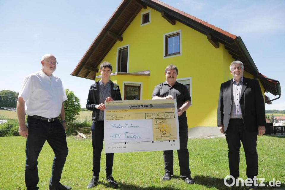An der Spendenaktion für den jungen Sebastian Hirschmann und seine Familie hat sich auch der Bayerische Fußball-Verband (BFV) beteiligt. Über seine Sozialstiftung hat der BFV 5000 Euro gespendet. Bezirksvorsitzender Thomas Graml, Kreisvorsitzender Albert Kellner und Georg Erras, Vorsitzender der Sportfreunde Ursulapoppenricht, sind zur Scheckübergabe zum renovierungsbedürftigen Haus gekommen.
