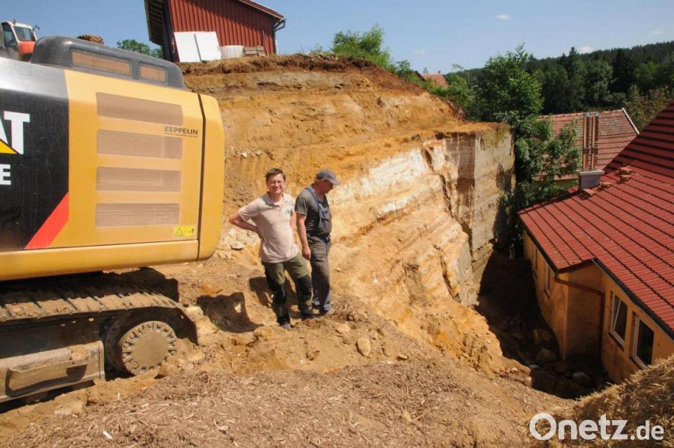 Was lange währt, wird endlich gut: In Steinling sind die Arbeiten zur Sicherung des von einem Felssturz bedrohten Hauses fast abgeschlossen. Markus Graf (links) von der Firma Land- und Forstpflege Graf Vilseck hat dafür gesorgt. Deren bewährter Baggerführer Wolfgang Uttendorfer hat eine Woche lang mit Überstunden geackert und den maroden Felskeil von oben her abgetragen. Eine Füllung aus Hackschnitzeln und Strohballen in der Schlucht zwischen Felswand und Gebäude sicherte das Haus gegen herabfallende Brocken. Mit einer Fräse wurden Felsschichten abgetragen und der Sandstein terrassenförmig zurückgeschnitten. Bagger und Radlader schafften inzwischen über 3000 Tonnen auf die Ablagefläche, "bis zum Abschluss wird es wohl an die 10 000 Tonnen herangehen", schätzt Graf. Für die Familie Röttcher mit ihren zwei kleinen Kindern, die seit März ihr Haus nicht mehr bewohnen durfte und im Wohnwagen lebte, ist das ein Segen: Sie kann an diesem Wochenende schon wieder einziehen - die Gefahr ist gebannt.