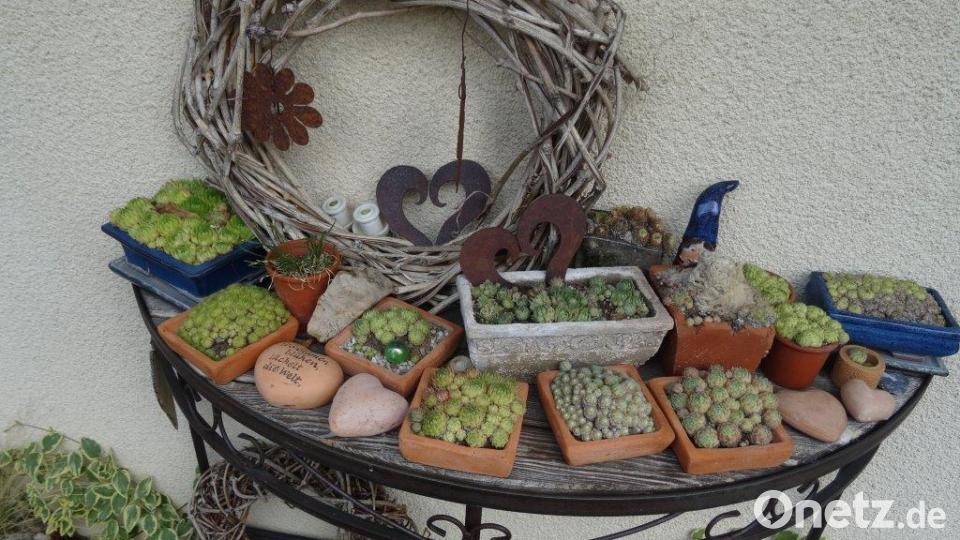 Von einer besonderen Liebe Helga Wiesmets künden zahlreiche Gefäße mit Hauswurzen. Große Rosetten dieser Dickblattgewächse in Grün- und Rottönen, andere mit langen Blütenstielen und ganz kleine, die wie Knöpfe dicht beieinander sitzen, sind in Tonschalen, Blechtöpfe, Ampeln, Körbe oder alte Dachziegel gepflanzt. "Nicht alle sind Hungerkünstler", sagt sie: "Die großen brauchen Erde und Wasser". Ihre Liebe zu Altem und Echten zeigt sich auch in vielerlei Geschirr, auf Flohmärkten erstanden und als Dekoration im Garten platziert.