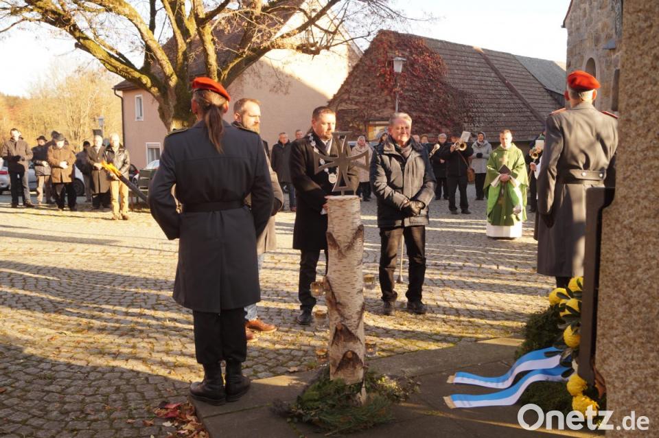 Ludwigs Antwort: "Lassen wir uns nicht von Neiddebatten und Verlustängsten anstecken. Lassen Sie uns gemeinsam für Frieden und Zusammenhalt einstehen. Lassen Sie uns die Opfer nicht vergessen." Während des Lieds vom „Guten Kameraden“ legte Bürgermeister Ludwig einen Kranz nieder. Dazu hallten drei Schüsse durchs Tal. Am Ehrenmal standen Reservisten aus Flossenbürg Ehrenwache. Mit dem Deutschlandhymne endetet die Feier. Pater Witold vom Kloster St. Feix segnete das Ehrenmal.
