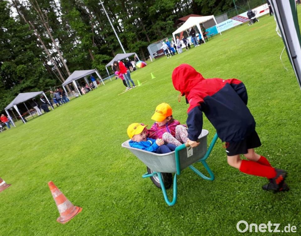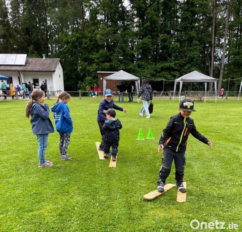 Im Anschluss bewiesen die Kinder an verschiedenen Stationen stolz ihr Können. Ob beim Grasskifahren, Schubkarrenwettrennen, oder einer Gummibärchenschleuder - so manches Mal mussten auch Mama oder Papa mit ran. Dank Unterstützung der Eltern und des Elternbeirats wartete ein buntes und reichhaltiges Buffet auf die hungrigen Kinder.