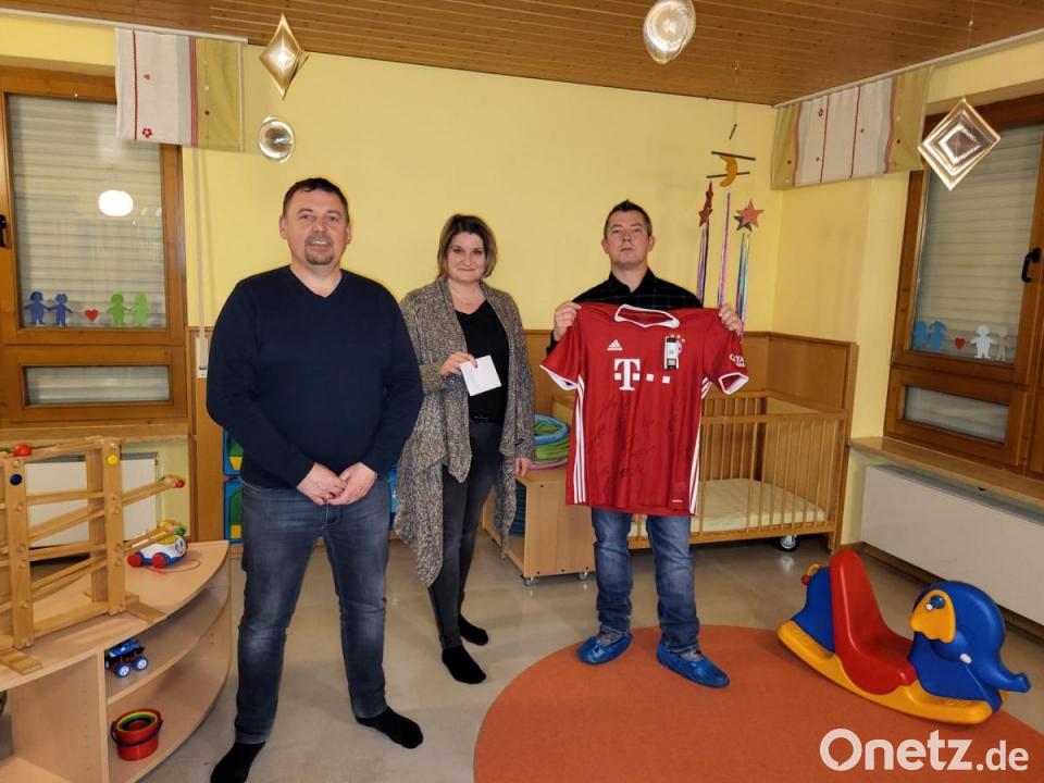 2020 wollte der FC-Bayern-Fanclub sein 40-jähriges Bestehen feiern. Die Pandemie zwang die Bayern-Fans zu einer Verschiebung des Festes. 2021 war wieder nicht angetan, ein großes Fest zu feiern, nur Weihnachtsfeier und Jahreshauptversammlung fanden statt. Dabei ersteigerte Ingo Rinaldi ein Trikot des FC Bayern, auf dem alle derzeit aktiven Spieler unterschrieben haben. Der Verein hat Rinaldis Höchstgebot auf 300 Euro aufgerundet mit dem Ziel, den Betrag zu spenden. Der Vorstand entschied: Die Spende soll der örtlichen Kindertagesstätte St. Franziskus zugute kommen, bei der die Erneuerung von Spielgeräten und die Anschaffung einer Matschanlage geplant sind. Eben dafür soll die Spende des Fanclubs nun zweckgebunden eingesetzt werden. Die Kita-Leiterin Christina Bröckl und Bürgermeister Markus Ludwig dankten bei der Übergabe im Namen der Einrichtung und der Kinder herzlich für die Unterstützung.