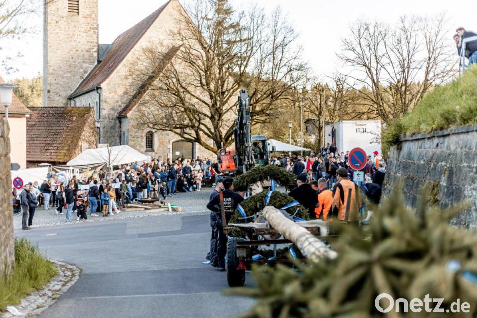 Die KLJB Störnstein hatte ihren Maiboten erst am Vormittag aus dem Wald geholt. Beim Aufstellen sorgte ein Bagger für einen sicheren Ablauf.