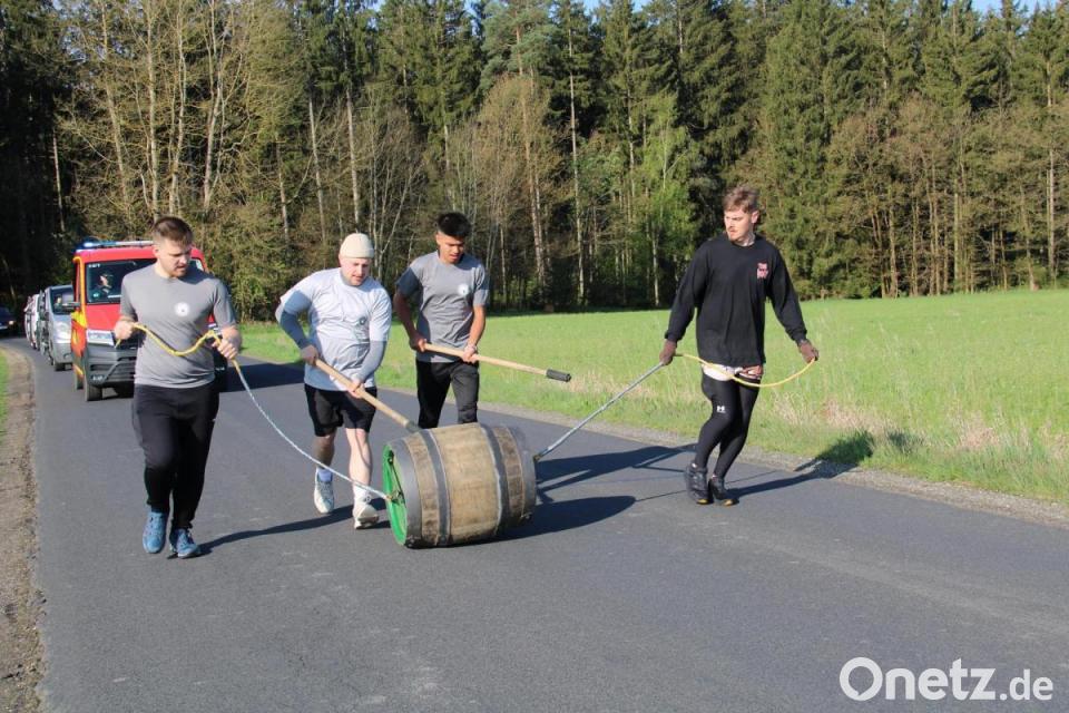 Doch dann wurde es ernst. Um 8.20 Uhr gab Ludwig das Startsignal und Maria Gnychushenko und Vlastimil Hetes aus Chodová Planá trieben mit ihren Stöcken das Fass an. Damit es in der Spur bleibt, dafür sorgten Mitorganisator Eka Reber und Feuerwehrkommandant Marius Schmid an den Seilen links und rechts. Reber organisiert die Läufer-Teams seit rund 14 Jahren. „Bisher hatten wir keine Probleme, genügend Läufer zu finden. Die kommen aber auch nicht nur aus Störnstein“, stellte er fest. Für deren Einsätze am Fass gibt es auch einen genauen Strecken- und Einsatzplan. Je nach Schwierigkeit der Strecke müssen die Läufer zwischen 500 Metern und 2,5 Kilometern laufen. Der Wechsel geschieht fliegend, jeder Läufer ist fünf bis sechs Mal an der Reihe. „Die Schwierigkeit dabei ist, dass das Team harmonieren muss, sowohl beim Antreiben, als auch bei der Sicherung an den Seilen.“