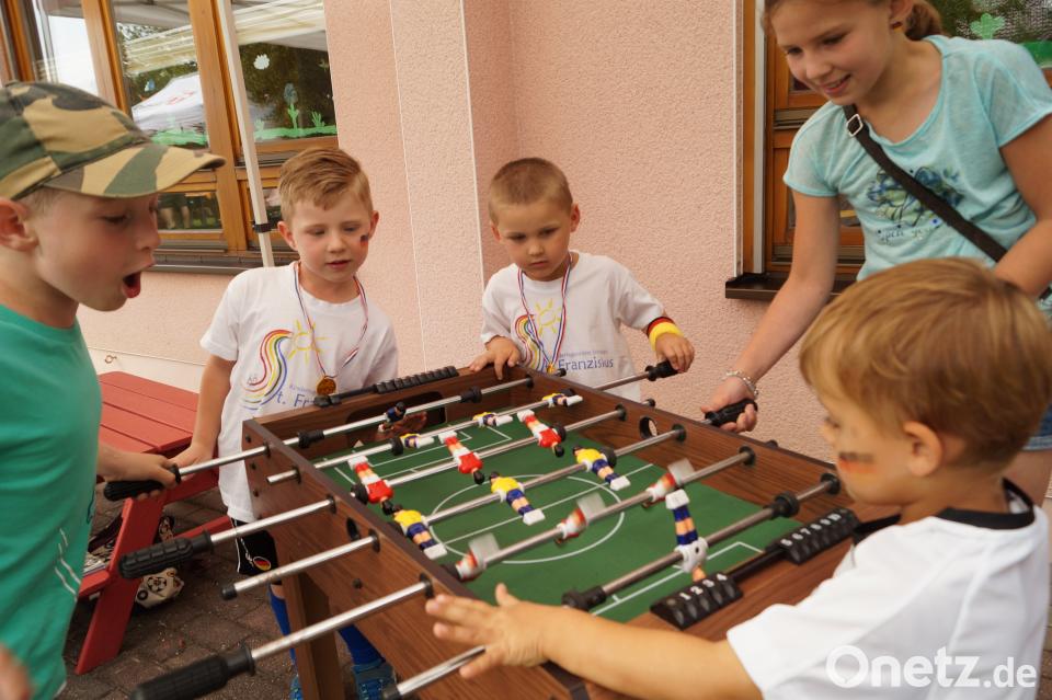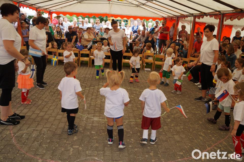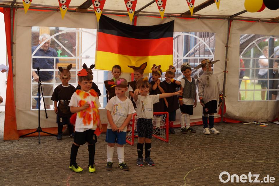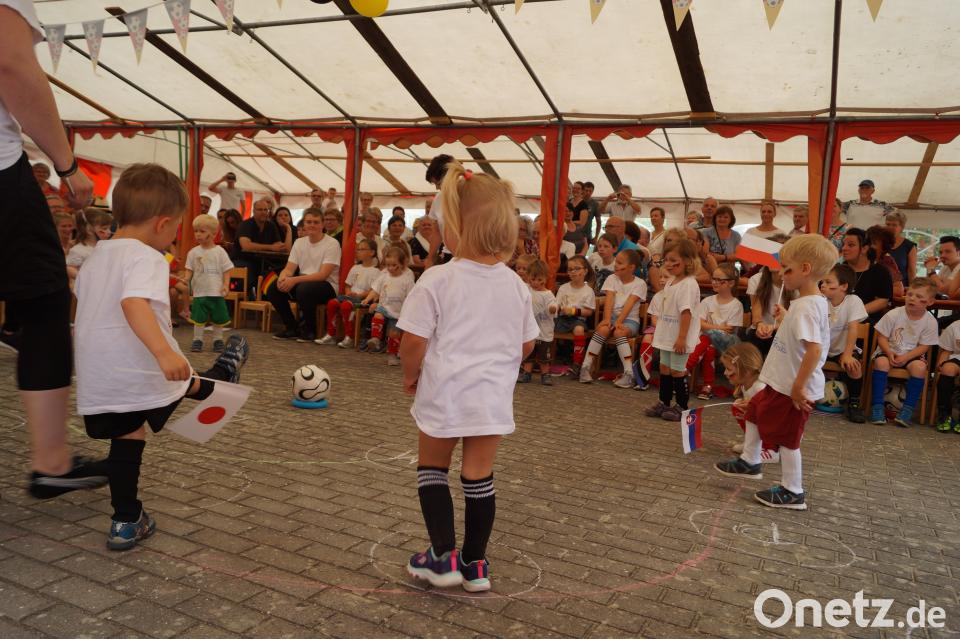 Mit weißen T-Shorts, Fußballkleidung und Fähnchen verschiedenster Nationen betraten die kleinen die "Kita-Arena". Kindergartenkind Marielle informierte die Besucher: "Die Mannschaft 1. FC Tierisch befindet sich noch in der Umkleidekabine. Wir holen den Weltmeisterpokal." Als erstes kamen die "Köngurus Hoppsi" aufs Spielfeld. Dann betraten die "Hasen" den Platz - "die schnellsten der Welt". Die Abwehr übernahmen die "Bären Bruno". Auch "Hugo der Hahn" ließ es sich nicht nehmen, das Feld mit aufzumischen. Zu dem Lied "Ein Hoch auf uns" eroberten die Kinder schließlich die verschiedensten Spiele, die vom Kita-Team aufgebaut worden waren. Beliebt waren Torwandschießen, die Kletterwand, das Kickerspiel oder auch die Herausforderung, Dosen mit Wasser umzuwerfen. Auch für die Erwachsenen war einiges geboten - unter anderem eine Tombola mit schönen Preisen sowie Kaffee und Kuchen.