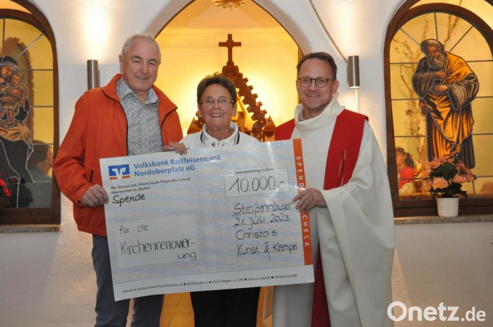 Drei Tage vor dem eigentlichen Namensfest des Heiligen Christophorus feierte Dekan Alexander Hösl in der Wildenauer-Kapelle, die dem Schutzpatron der Reisenden geweiht wurde, den Patroziniumsgottesdienst. Bestens vorbereitet von der ganzen Familie konnten wieder viele Besucher vor dem Kirchlein Platz nehmen. Ein großer Augenblick wurde Dekan Hösl und Kirchenpfleger Günter Hassmann nach der Feier beschert, als Christa Wildenauer das Geheimnis um ihren mitgebrachten Scheck lüftete. Als Anschubfinanzierung für die geplante Renovierung der Vohenstraußer Stadtpfarrkirche überreichte sie 10.000 Euro an den Träger und Vertreter der Kirchenverwaltung. Mit dieser unglaublichen Summe möchte die unermüdliche Flohmarktsammlerin die Renovierung unterstützen.