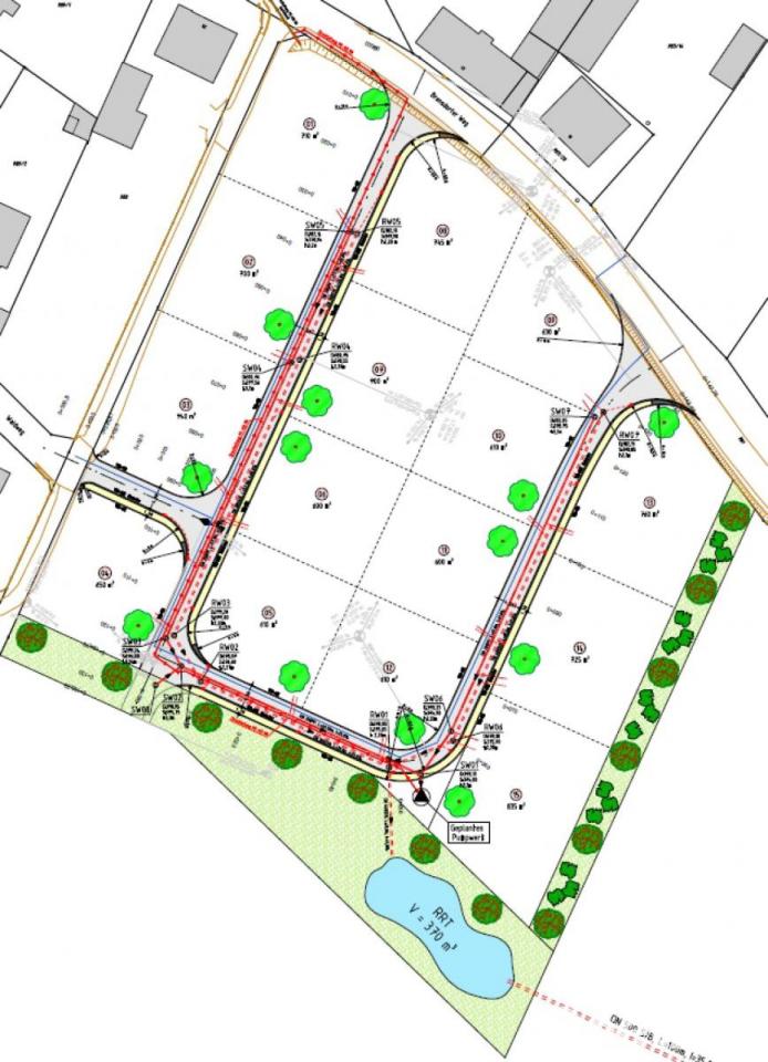 Ingenieur Manfred Pirner beschrieb zunächst folgende Eckdaten: Das Planungsgebiet umgreift 1,4 Hektar mit 15 Parzellen in der Größenordnung von 600 bis 835 Quadratmeter. Die Entwässerung erfolgt im Trennsystem mit einem Regenrückhalteteich, die Straßenlänge beträgt 320 Meter. Der sechs Meter breite Korridor gliedert sich auf in die Straße von 4,50 und den Gehweg von 1,50 Meter. Für eine eventuelle Ausweitung des Baugebiets in Südrichtung sind bauliche Maßnahmen bereits berücksichtigt. Im Dialog mit den Gemeinderäten ging Pirner auf Standards, technische Details wie Straßenunterbau, Asphaltschichtstärke, Gehwegausbau mit Wasserführung und das Teichvolumen ein.