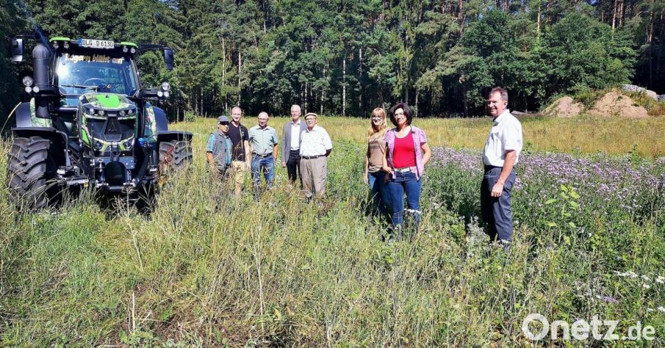 Abschließend wurde eine Stilllegungsfläche des Obermeier-Betriebs am Waldrand besucht, die als Blühfläche angelegt ist. Dort kämpfen die bunten Pflanzen gegen die Trockenheit des Sommers an, die vor allem den blau blühenden Disteln wenig auszumachen scheint. Denn sie gedeihen prächtig und dienen als "Bienenweide".