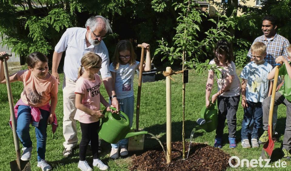 Der Gartenbau – und Verschönerungsverein spendete zur Erinnerung an die Erstkommunion 2018 ein Apfelbäumchen. Pfarrer Heinrich Rosner (mit Gießkanne) „taufte“ mit den Drittklässlern im Beisein von Vorsitzendem Hubert Obermeier und Pfarrvikar Joseph Kokkoth (von rechts) den jungen Spross auf den Namen „Gerlinde“.