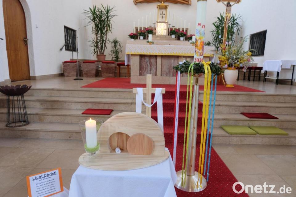 Die brennende Kerze am linken Tischrand wird jeden Morgen mit dem Feuer der Osternacht, das geschützt durchgehend in der Sakristei brennt, entfacht und gegen 18.30 Uhr ausgelöscht. Die Kirchenbesucher können in dieser Woche unter Wahrung der Einschränkungen im öffentlichen Raum wegen der Coronakrise das Gotteshaus aufsuchen, eine Kerze am Osterlicht entzünden und nach Hause oder zum Friedhof bringen.