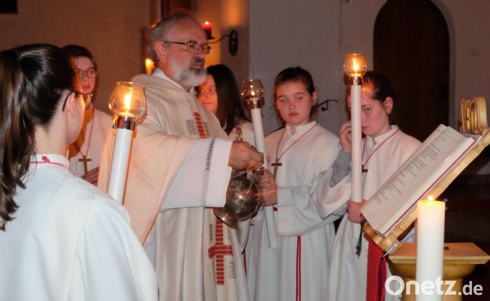 Die Lichter der Gläubigen und die Kerzen im Altarraum tauchten das Kirchenschiff während der Liturgiefeier in österliche Atmosphäre. "Wir sind befreit aus schuldhafter Verstrickung, nicht aus eigener Kraft, nicht selbst verdient, sondern geschenkt von Gott. Einfach so. Aus reiner Gnade, ohne Vorleistung. Aus überfließender Liebe, dem göttlichem Heilsplan gemäß." Mit diesen Worten der Schriftstellerin Ingrid Penner leitete der Geistliche seine Predigt ein. Fern von allen Ablenkungen des Tages könnten sich die Menschen "ganz bei sich" in dieser Nacht dem Geheimnis des Glaubens nähern.