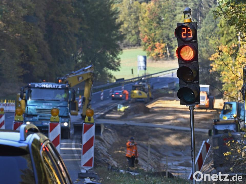 Für die Dauer der Arbeiten ist die Bundesstraße dort nur einspurig befahrbar, besagte Ampel regelt mit ihrer "Schwester" den Verkehr entlang der Baustelle. Beide Geräte kommunizieren per Funk. Schaltet die eine auf Rot, beginnt bei der anderen per Digitalanzeige der Countdown bei 43 Sekunden bis zur Grünphase. Derweil kann sich die Fahrspur leeren. Die Wartenden erfahren so, dass es bald weitergeht, und können ihren Motor wieder rechtzeitig starten.