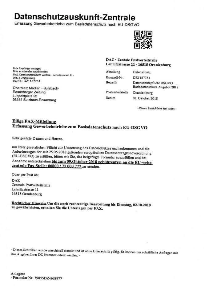 Das Fax liegt eines Morgens im Ausgabefach, es kommt aus Oranienburg: "Datenschutzauskunft-Zentrale" steht oben drauf, "Erfassung Gewerbebetriebe zum Basisdatenschutz nach EU-DSGVO". Die Oberpfalz-Medien/Sulzbach-Rosenberger Zeitung sind der Adressat. Und sie schauen genauer hin, um was es sich bei dem Schreiben mit einem zumindest halboffiziellen Anstrich handelt.
