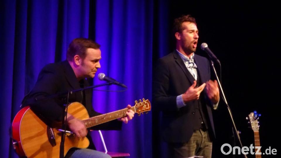 Der Kabarettist und Schauspieler Leonhardsberger moderiert den Abend mit viel Charme und Spontanität, tanzt, springt und wirbelt über die Bühne, besticht mit seiner sexy Stimme. Immer wieder greift auch er zur Gitarre, bringt Trauer ebenso zum Ausdruck wie schwarzen Humor. Perfekt unterstützt ihn dabei Martin Schmid, der ihn mit der Gitarre einfühlsam begleitet und mit sparsamer Mimik und treffenden Sätzen ein ruhender Gegenpol zu Leonhardsbergers quirliger Performance ist. Neben der großen Showgeste haben aber auch leise Momente ihren Platz. So schon ganz am Anfang, wenn die beiden Künstler die Besucher nach Leonard Cohens „Halleluhja“ bitten: „Leihds uns gnädig eier Ohr“ oder wenn sie nach der Musik von Bruce Springsteen die Liebe am Almsee beschreiben, die erste und die vergangene. Eine CD haben Leonhardsberger und Schmid nicht anzubieten, dafür aber ein schwarzes „Stoffsackerl“ mit dem Gesicht von Billi Jean, „ein Merchandising-Produkt nachhaltig und umweltfreundlich“.