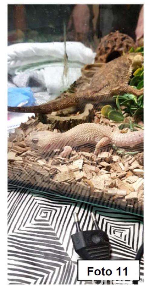 - eine von Parasiten befallene Bartagame und ein Gecko, die zusammen in einem viel zu kleinen und kalten Aquarium(!) untergebracht waren;
