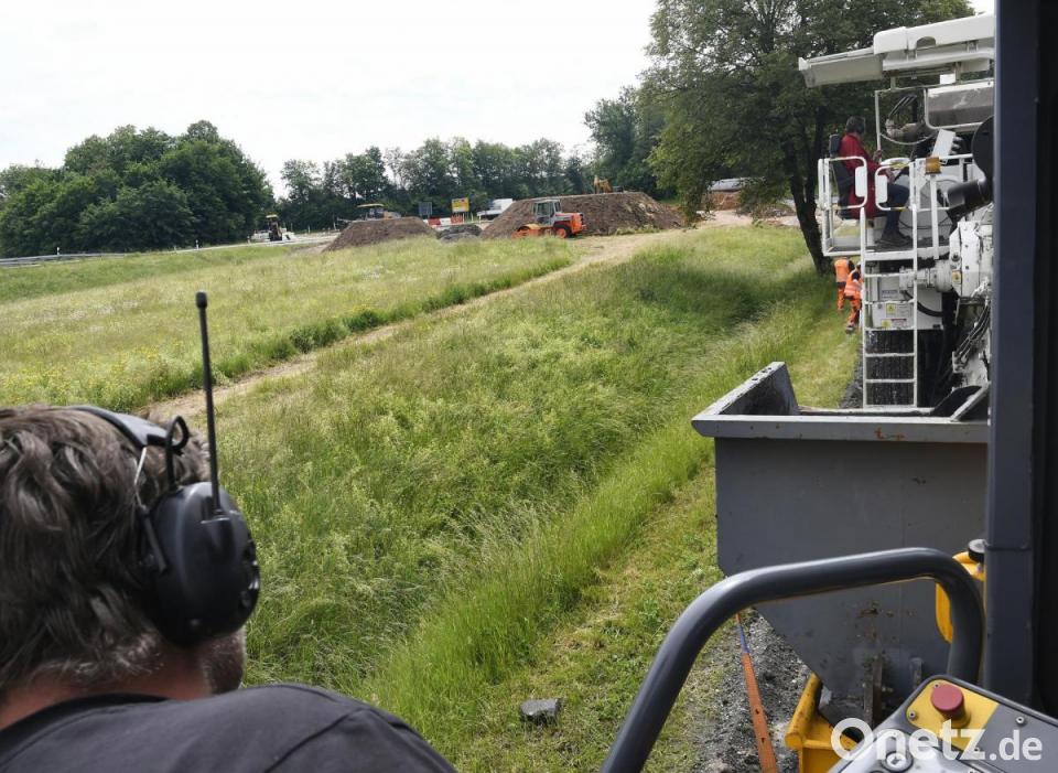Wie Baudirektor Stefan Noll informiert, kamen wegen der großen Fahrbahnbreite durch die Ein- und Ausfädelstreifen im Bereich des Anschlusses zur B 14 / St 2164 ausnahmsweise drei Asphalt-Fertiger und ein riesiger "Beschicker" gleichzeitig und parallel zum Einsatz, um die hier einzubauenden 1200 m³ Asphaltbinder und am Dienstag nochmals 15 000 m² Deckschicht zu realisieren. "Der parallele Einsatz machte am Montag die neue Binderschicht möglich, die ,heiß an heiß' zur Vermeidung von Längsnähten umgesetzt wurde. Der Beschicker seinerseits dient der Verbesserung der Einbauqualität und -bedingungen und schluckt in seinem Bunker innerhalb kürzester Zeit einen kompletten Sattelzug Mischgut, so dass diese sehr schnell entladen und die nächste Fuhre holen können", sagt Stefan Noll. Ferner gewährleiste der Beschicker eine erneute thermische Homogenisierung, die auch für die Qualität des Mischgutes wichtig ist, und eine kontinuierliche Versorgung über seine schwenkbare Förderanlage. Die Arbeiten in diesem Bereich sollen noch bis Samstag, 13. Juni, andauern.