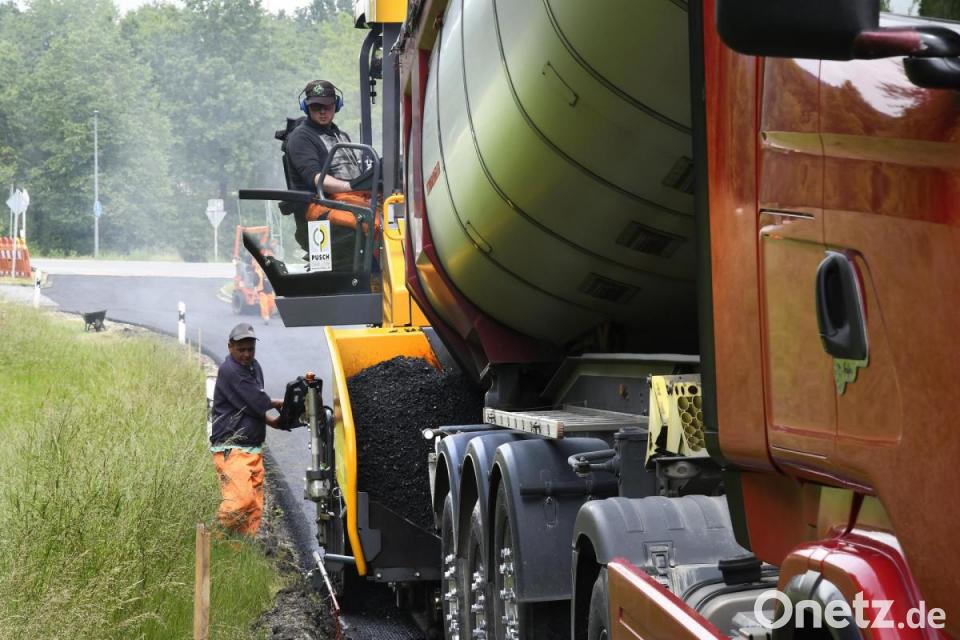 Drei Asphalt-Fertiger sorgen auf der B 85 im Parallel-Einsatz für neuen Fahrbahnbelag