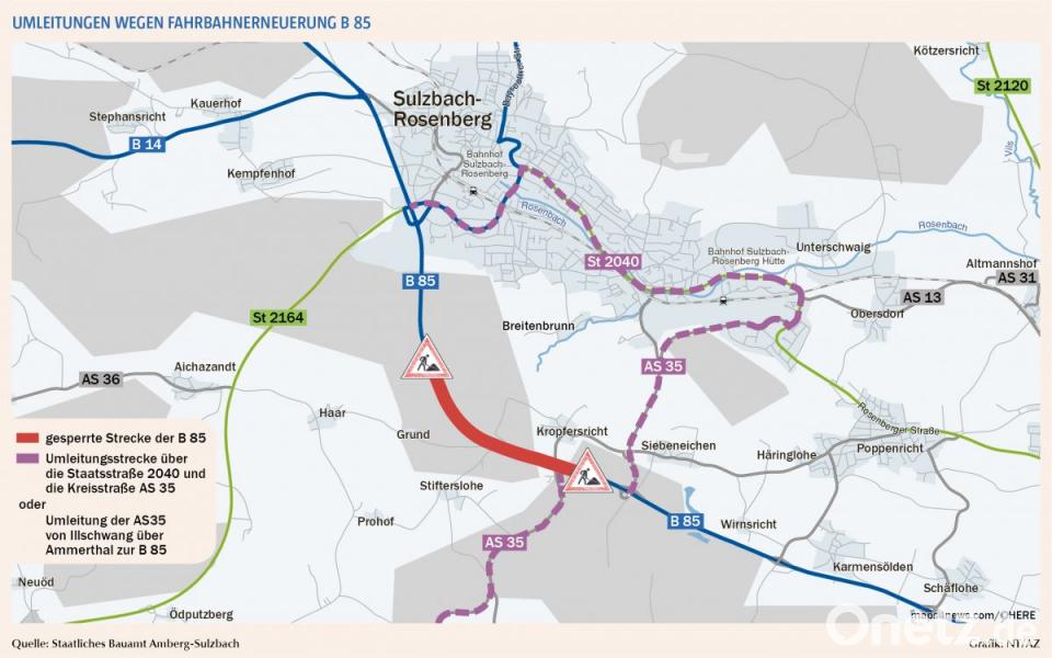Dazu wird ab Montag, 19. November, für rund drei Wochen die B 85 zwischen der Europastraße (AS 35) bei Kropfersricht und Sulzbach-Rosenberg (Kreuzung B 85/B 14/Staatsstraße 2164) voll gesperrt. "Die anstehenden Arbeiten, wie etwa das Abfräsen der verbrauchten und schadhaften Asphaltschichten sowie die Verstärkung und Erneuerung von Asphaltschichten lassen sich aus Gründen des Arbeitsschutzes nur unter Vollsperrung der B 85 ausführen", ergänzt Stefan Noll. Die Umleitung läuft gemäß einer Presseinformation ab dem Knotenpunkt B 85/B 14/Staatsstraße 2164 bei Sulzbach-Rosenberg (BePo) über die B 14 durch Sulzbach-Rosenberg und weiter über die Staatsstraße 2040 und die Kreisstraße AS 35 zurück zur B 85 bei Siebeneichen. In der Gegenrichtung erfolgt die Umleitung in analoger Weise. Die Umleitungsstrecke ist ausgeschildert. Die von Illschwang über die Kreisstraße AS 35 zur B 85 (beim Happy-Rock) orientierten Verkehrsteilnehmer werden gebeten, über Ammerthal auszuweichen. "Das Staatliche Bauamt bittet alle betroffenen Verkehrsteilnehmer um Verständnis für die während der Bauzeit auftretenden, jedoch unvermeidbaren, Einschränkungen und Verkehrsbehinderungen. Zur Vermeidung von Gefährdungen der Straßenbauer und zur Vermeidung von Beeinträchtigungen des straffen Ablaufes bitten wir alle Verkehrsteilnehmer, der Umleitung und der Beschilderung strikt Folge zu leisten und um eine rücksichtsvolle und besonders aufmerksame Teilnahme am Straßenverkehr", nennt Bauoberrat Stefan Noll ein wichtiges Anliegen. Wenn die Witterung mitspielt, rechnet er mit dem Abschluss der Straßenbaumaßnahme in den ersten Dezembertagen.