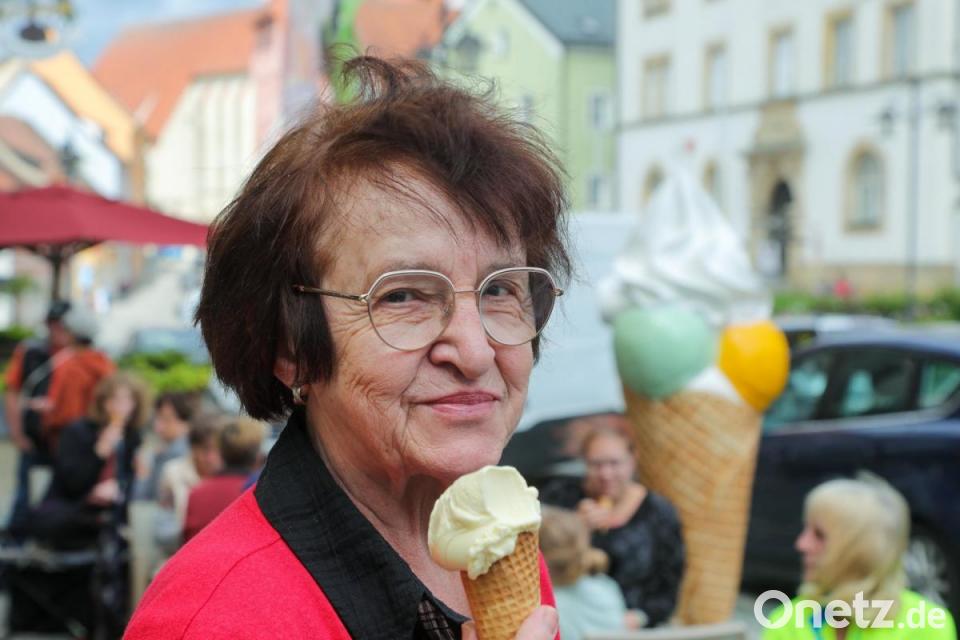 Ein paar Meter weiter schleckt Helga Lehnerer aus Amberg an ihrem Vanilleeis. Sie machte zum ersten Mal an der Eisaktion von Oberpfalz-Medien mit. "Ich hab daraus aus der Zeitung erfahren und habe den Besuch bei meiner Bank in Sulzbach-Rosenberg gleich mit dem Eisessen verbunden." Die Aktion findet die rüstige 70-Jährige gut. "Das ist eine kleine Aufmerksamkeit für uns Leser, das könnte man auch ruhig zweimal im Sommer machen", regt sie an. Das Eis schmecke ihr jedenfalls "immer. Auch bei Wind und Wetter", sagt sie.