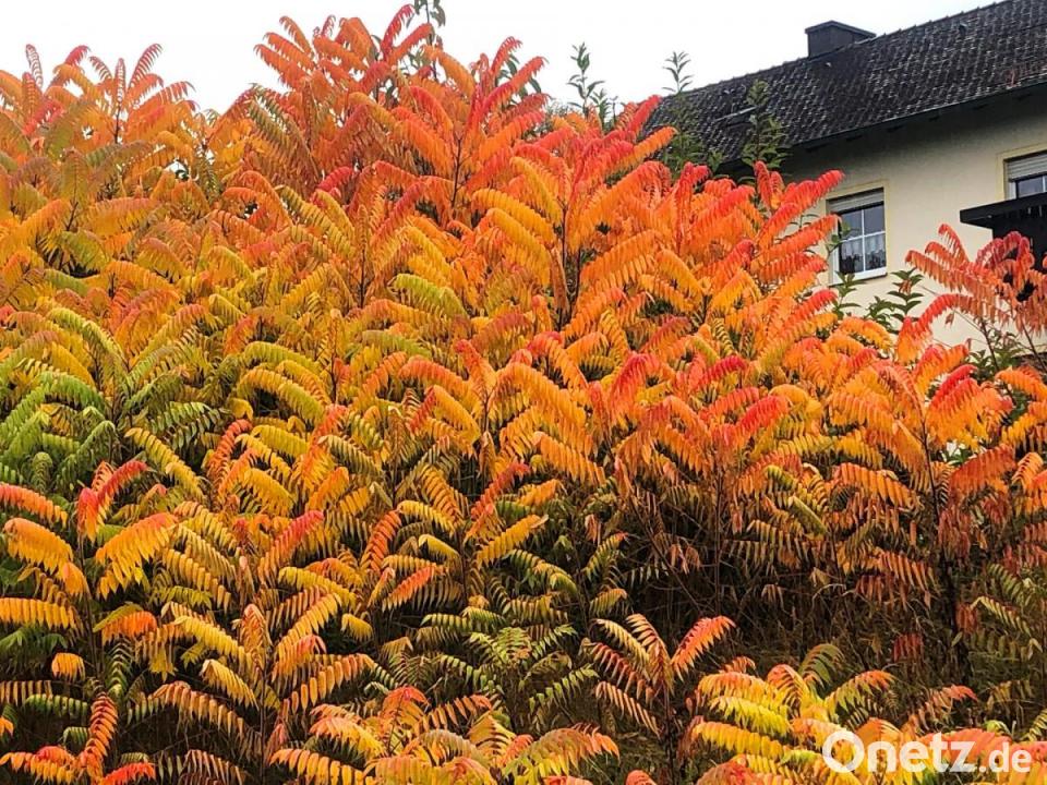 Die Blätter der auch Hirschkolben-Sumach genannten und ursprünglich aus Nordamerika stammenden Essigbäume verfärben sich im Herbst von zunächst grün nach gelb, später orangefarben und im Oktober leuchtend karmesinrot. Der Name Essigbaum geht laut Wikipedia auf den Umstand zurück, dass seine säurehaltigen Früchte dem Essig zugesetzt wurden, um dessen Säure zu verstärken. Probleme bereitet der Baum allerdings oft durch seine über Wurzelausläufer unkontrollierte Ausbreitung. Eine ausreichend tiefe Wurzelsperre kann hier vor der Pflanzung sehr nützlich sein. Die prächtige Essigbaum-Gruppe auf unserem Bild wächst in der Max-Reger-Straße in Sulzbach-Rosenberg.