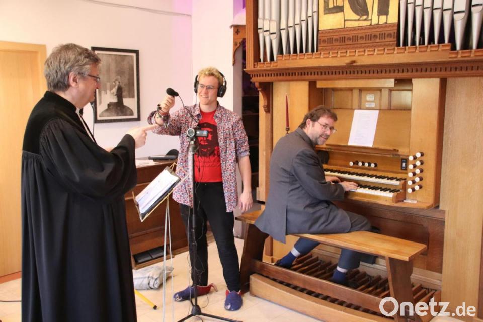 Während es für einen normalen Gottesdienst in der Kirche eine Liturgie gibt und festgelegt ist, welche Texte der Pfarrer am Altar, auf der Kanzel oder am Ambo spricht, müssen Jonas Hennecke, sein Vater und der Dekan das jetzt ausprobieren. Der Kameramann stellt dann die Beleuchtung ein, richtet die Kamera auf den Geistlichen und gibt genaue Anweisungen: "Herr Dekan, noch einen halben Schritt nach rechts und die Hände ein bisschen höher!" Kirchenmusikdirektor Hennecke untermalt und begleitet den Dekan an der Orgel.